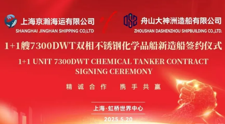 5月20日,舟山大神洲造船有限公司與上海京瀚海運有限公司舉行1+1艘7300DWT雙相不銹鋼化學品船新造船簽約儀式。