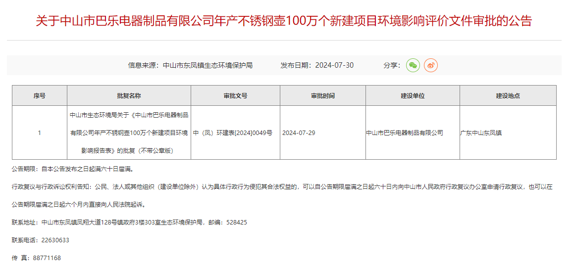 7月30日,中山市東鳳鎮(zhèn)生態(tài)環(huán)境保護(hù)局就中山市巴樂電器制品有限公司年產(chǎn)不銹鋼壺100萬個新建項目環(huán)境影響評價文件作出審批意見并對外進(jìn)行公告,公告期限:自本公告發(fā)布之日起滿六十日屆滿。